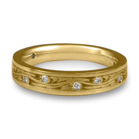 This gold wedding ring, reminiscent of the Van Gogh painting by the same name, has symbolism that suggests fluid movement, the ease of water curving through earth, or clouds in the night sky sparkling with stars. To us, the ring symbolizes a relationship intimate with the movement of all things; a relationship as full of possibility and inspiration as the play of form and emptiness.18K Yellow Gold Dimensions: 4mm Wide