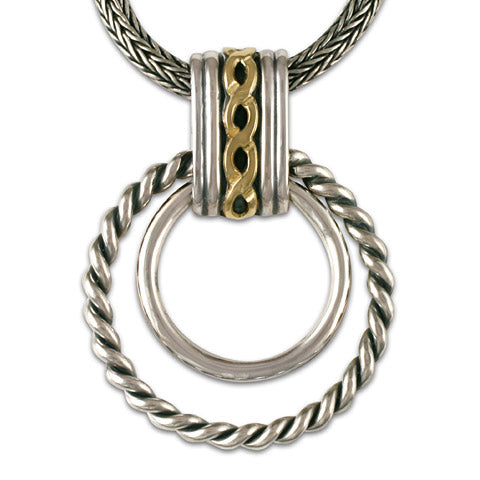 The Links Pendant is a plethora of ropes, hand-woven chains, and circles. There is so much texture within this necklace, while still maintaining a clean and classic look. There is a lot of movement within this piece. Shown
